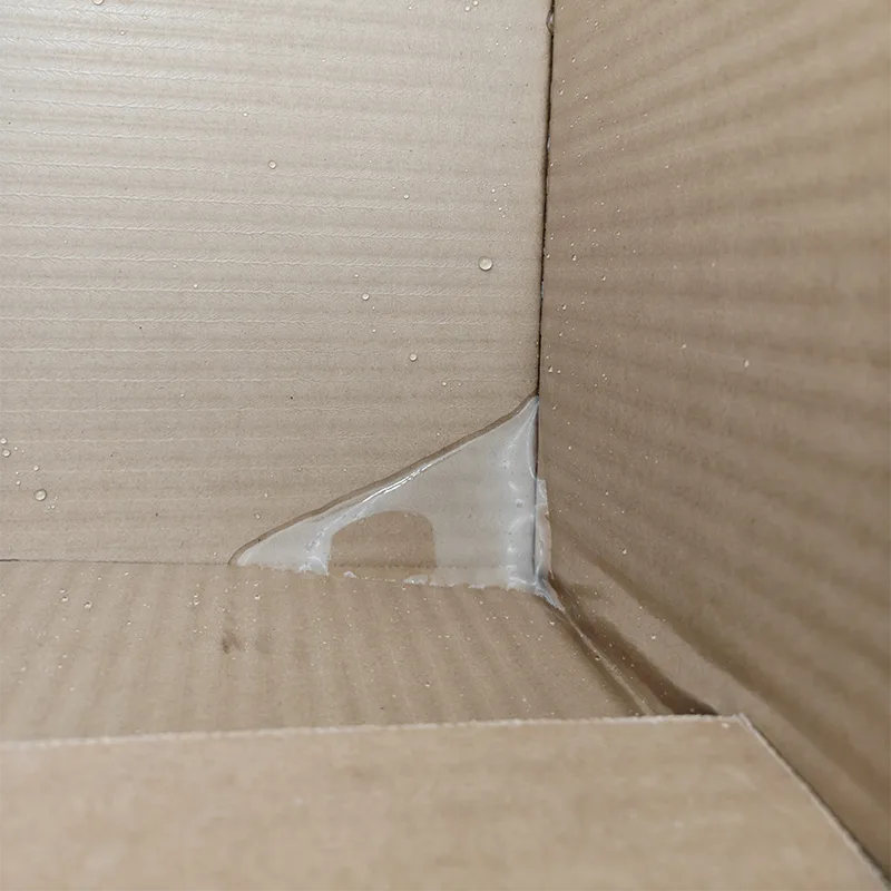 ● I gcás cásanna cosúil le stóráil cistine, iompar ar laethanta na coise tinne, agus láimhdeachas táirgí úra a d'fhéadfadh teacht ar uisce, tá an taobh amuigh den bhosca clúdaithe go hiomlán le scannán céir trédhearcach grád bia. Is féidir anlann soighe nó uisce a dhoirteadh de thaisme a ghlanadh go héasca le héadach, agus ní scarfaidh an scannán céir amach ná ní ligfidh sé don taise dul isteach sna sraitheanna páipéir, rud a fhágann go laghdóidh an bosca. Fiú amháin i gcás splashes báisteach éadrom gairid, ní bheidh aon marcanna uisce ann, agus níl aon athrú ar chruas an bhosca.