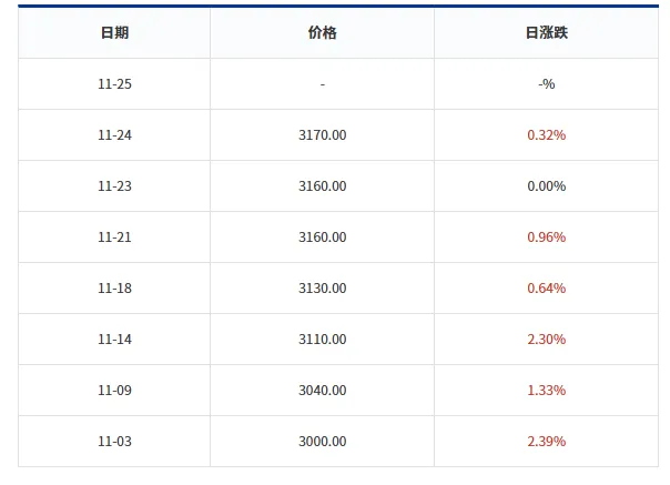 Maidir le páipéar rocach 140g/m², chuaigh praghsanna suas 12.09% idir 16 Deireadh Fómhair agus 16 Samhain, 2025. Thar fhuinneog níos faide (27 Lúnasa go 25 Samhain), bhuail gnóthachain carnacha 20.99%. Faoi 24 Samhain, shroich an praghas is déanaí 3170 RMB in aghaidh an tonna, le coigeartuithe beaga aníos ag leanúint ar aghaidh.